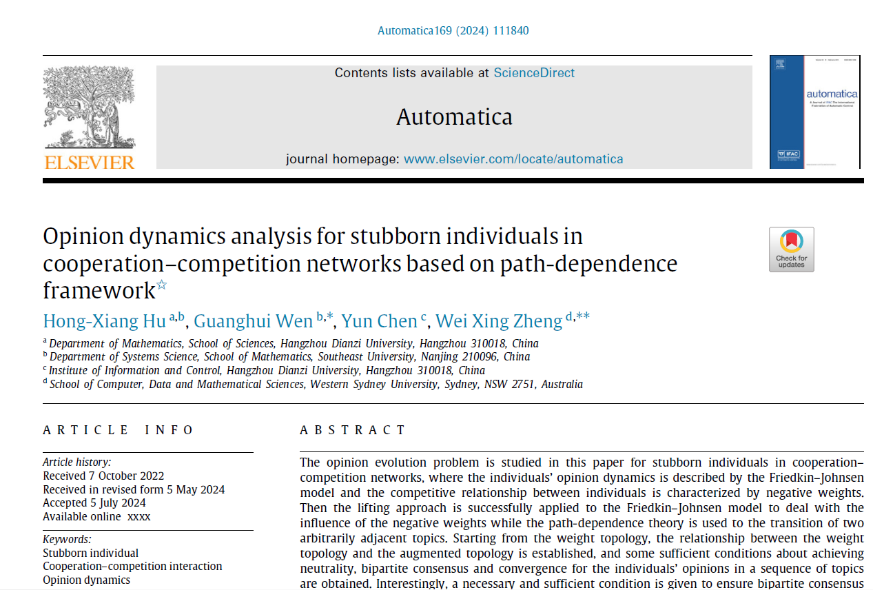 近日,我校理学院胡鸿翔教授作为第一作者,以久久精品一区二区为第一单位在国际系统控制领域顶级期刊《Automatica》上以长文 (Regular Paper) 形式发表了题为“Opinion dynamics analysis for stubborn individuals in cooperation–competition networks based on path-dependence framework”的研究论文。