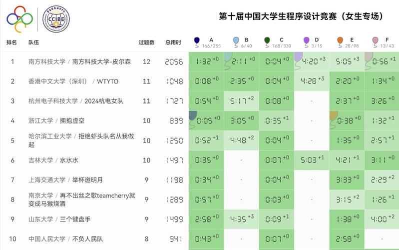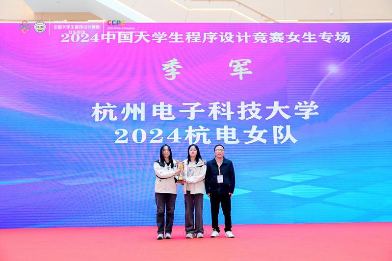 本次CCPC女生专场赛共有来自全国100余所高校的170支队伍报名参赛。经过激烈角逐,最终共有17支队伍获得本年度CCPC女生专场比赛的金奖。其中,来自南方科技大学的“南方科技大学-皮尔森”队获得冠军,香港中文大学(深圳)的“WTYTO”队获得亚军,我校由卓越学院2023级俞越、2022级陈姿颖组成的“2024杭电女队”成功解出全部13道题目中的11题,获得季军,这也是我校在这项赛事中取得的历史最好成绩。